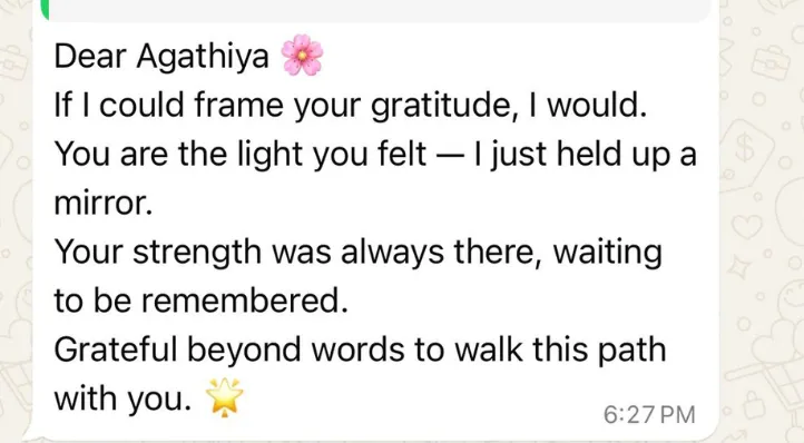 Agathiya’s journey is not just professional—it's profoundly personal. A survivor of childhood sexual abuse and narcissistic trauma, she turned her deepest wounds into wisdom that now helps others reclaim their lives. For over a decade, she walked the healing path herself—not just through books or theories, but through lived experience.